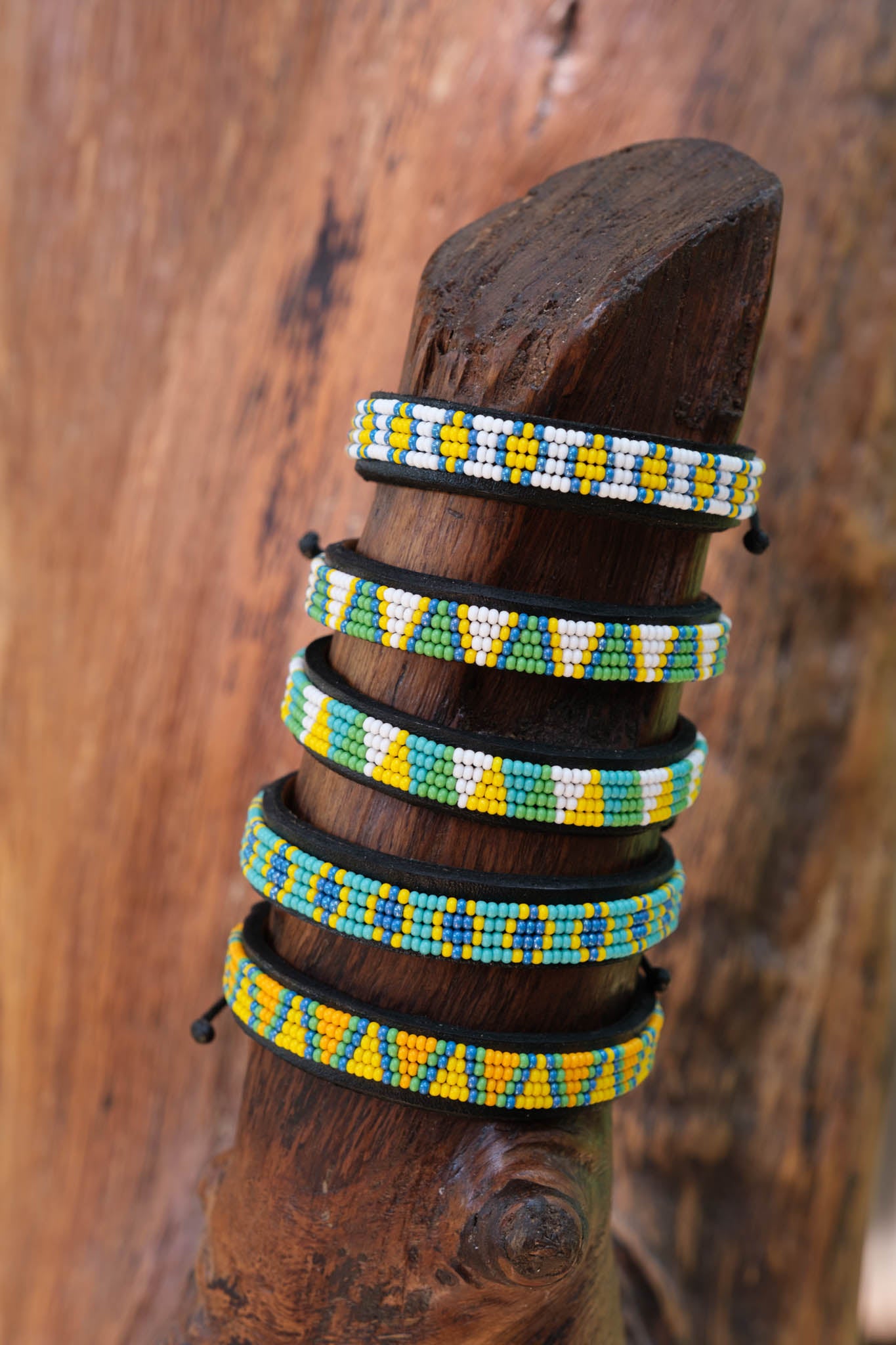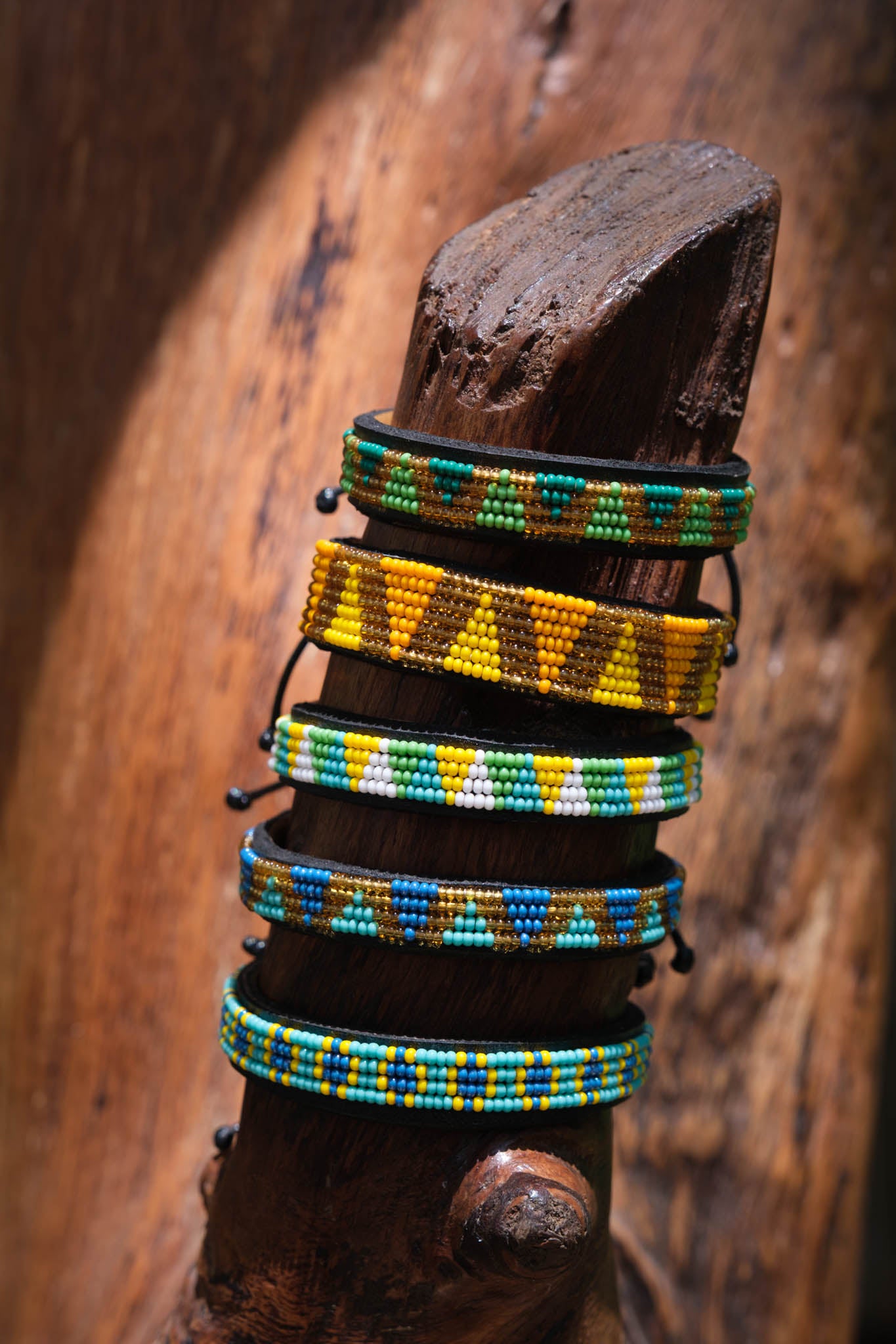 Glass beads on leather with a soft leather backing. Sliding Macrame closure. We can brand the inside with your logo!