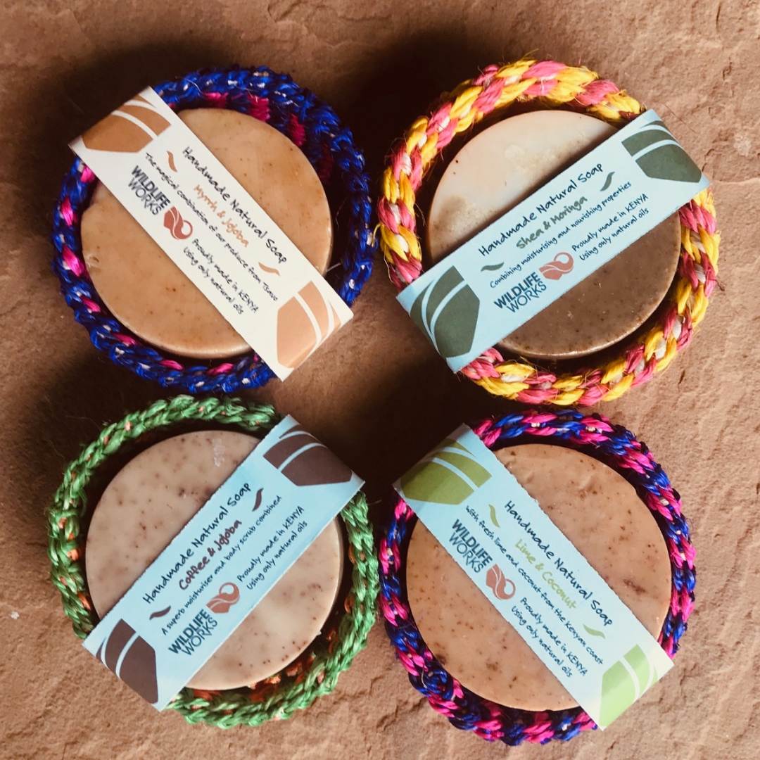 Disc shape bar of 100 grams, wrapped in cling film and packaged in a sisal basket made by Hadithi artisans from Buguta Disabled group.