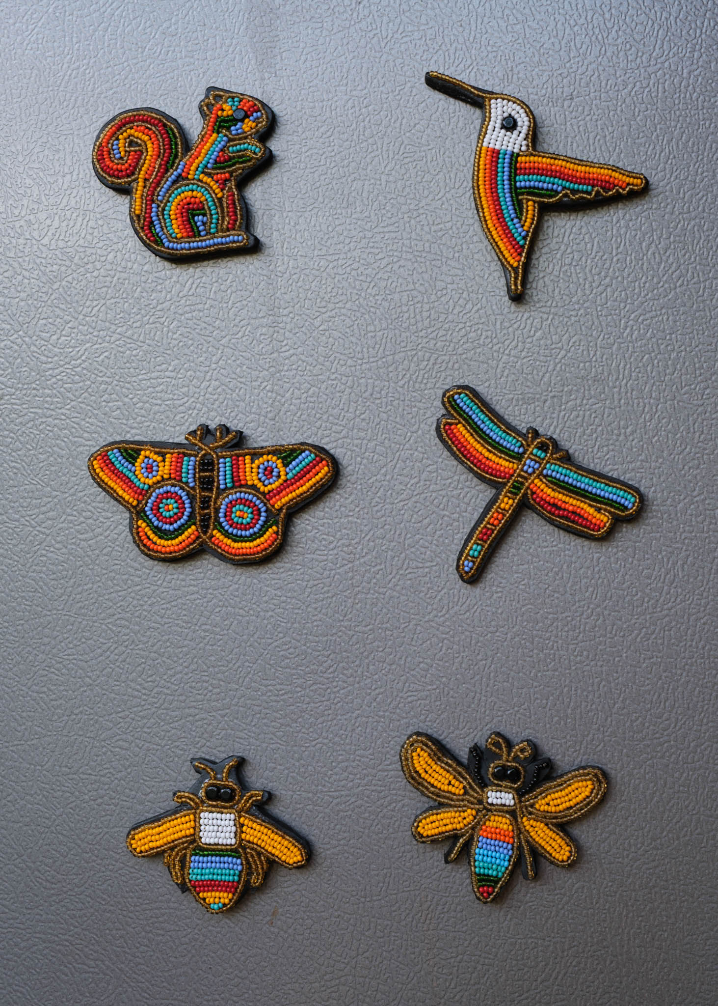Handcrafted with colourful glass beads stitched onto leather, each magnet is full of character and detail. A strong backing makes them perfect for adding a joyful, handmade touch to fridges, notice boards, or workspaces.