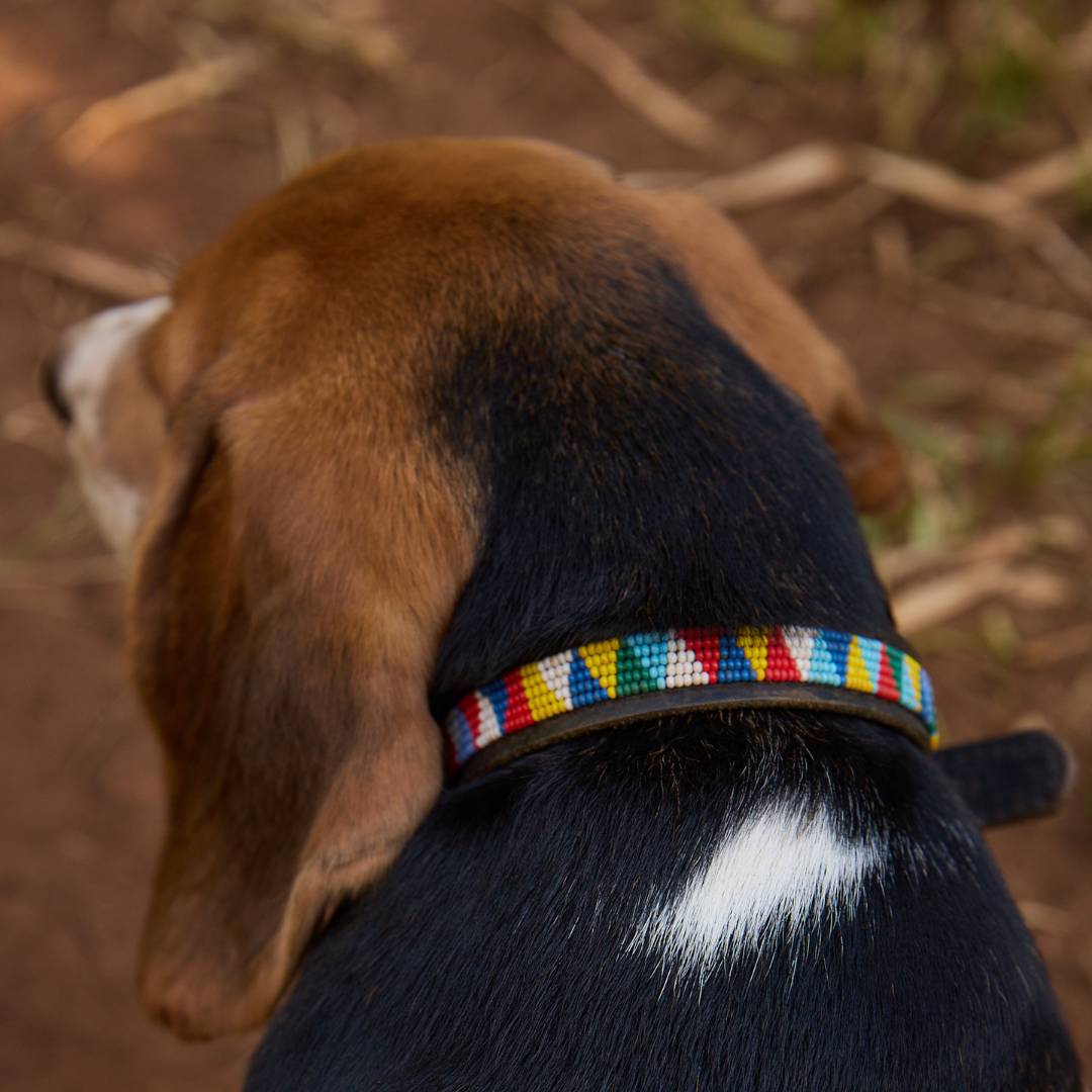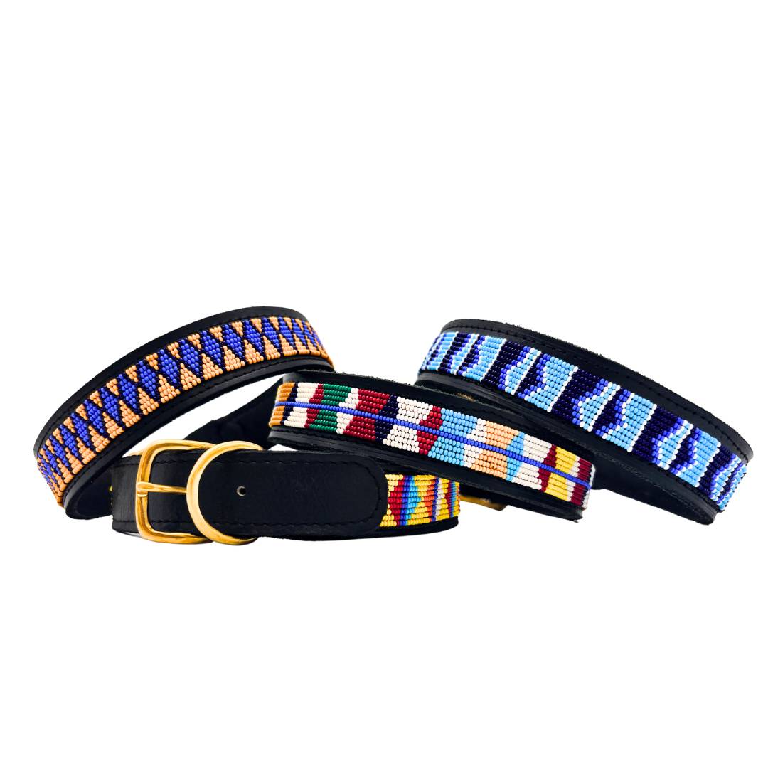 Dog collars made from glass beads on leather with brass buckle. Every collar is unique and a reflection of the artist's expression.