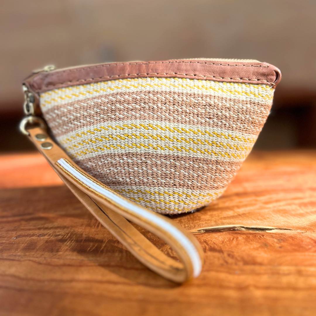 A handmade fineweave sisal basket with zipper with beaded leather wrist strap.